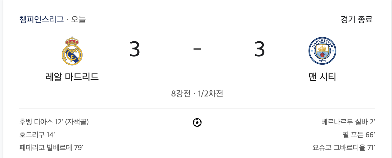 레알 마드리드와 맨체스터 시티의 챔피언스리그 8강 1차전은 공방 끝에 3-3으로 무승부로 끝났다.